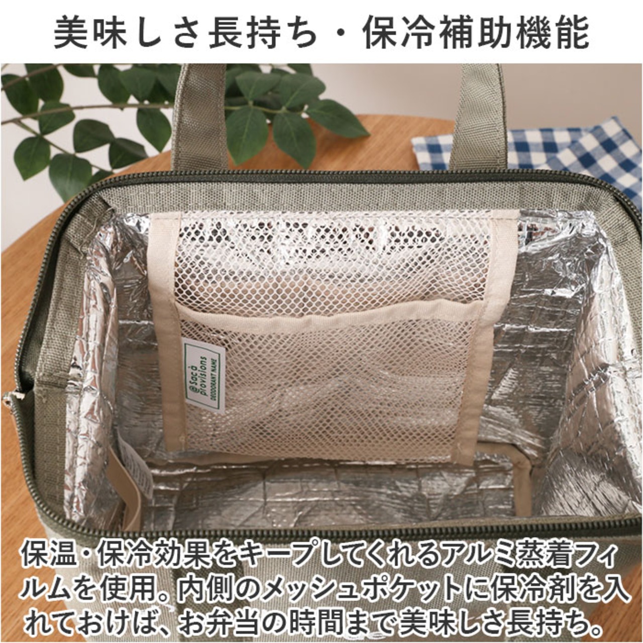 ・保温・保冷効果をキープしてくれるアルミ蒸着フィルムを使用。内側のメッシュポケットに保冷剤を入れておけば、お弁当の時間まで美味しさ長持ち。