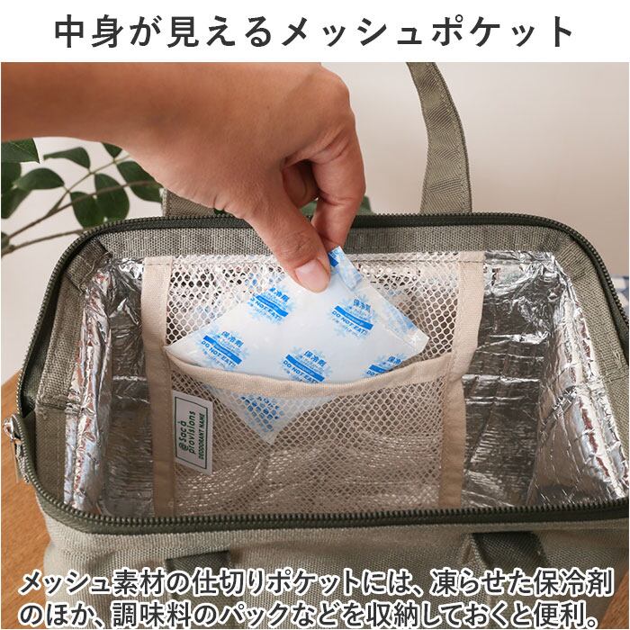 ・メッシュ素材の仕切りポケットには、凍らせた保冷剤のほか、調味料のパックなどを収納しておくと便利。