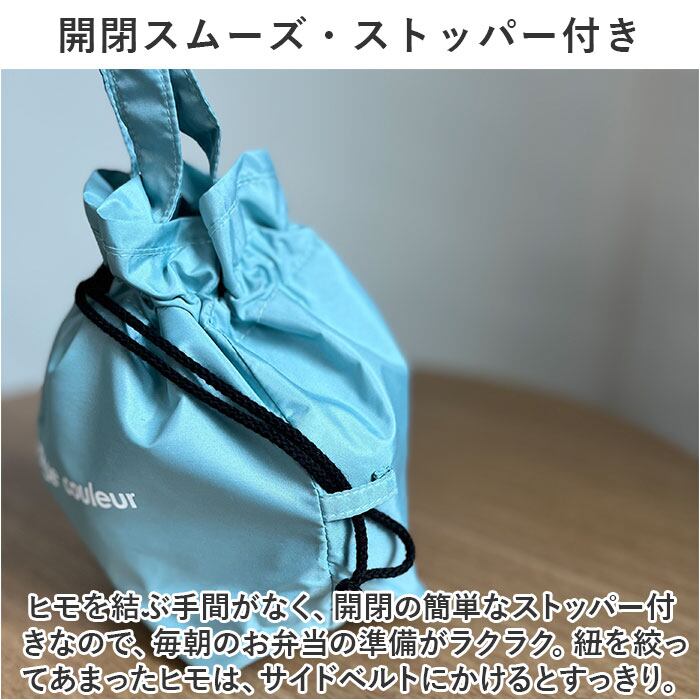 ・ヒモを結ぶ手間がなく、開閉の簡単なストッパー付きなので、毎朝のお弁当の準備がラクラク。紐を絞ってあまったヒモは、サイドベルトにかけるとすっきり。