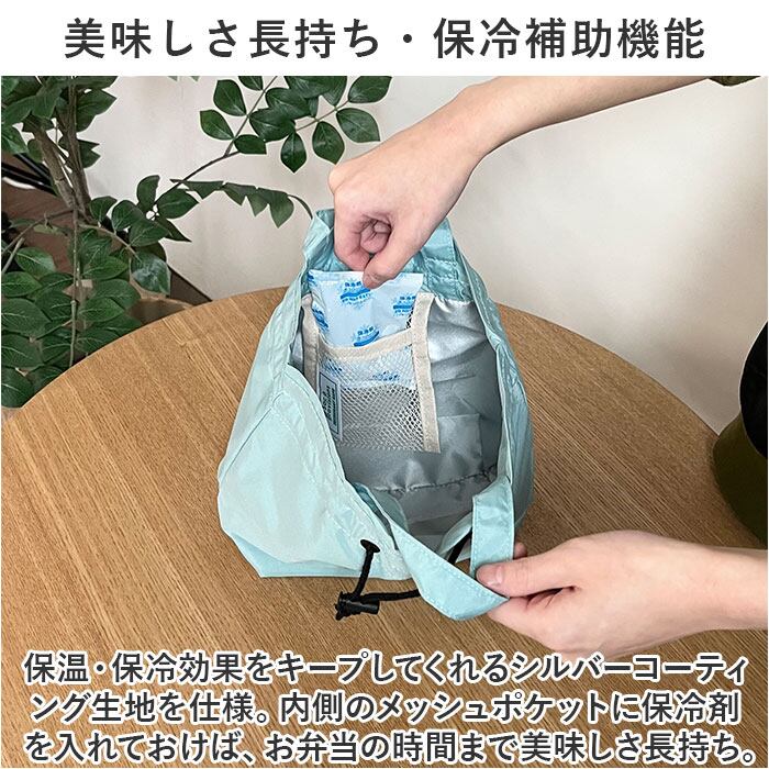 ・保温・保冷効果をキープしてくれるシルバーコーティング生地を仕様。内側のメッシュポケットに保冷剤を入れておけば、お弁当の時間まで美味しさ長持ち。