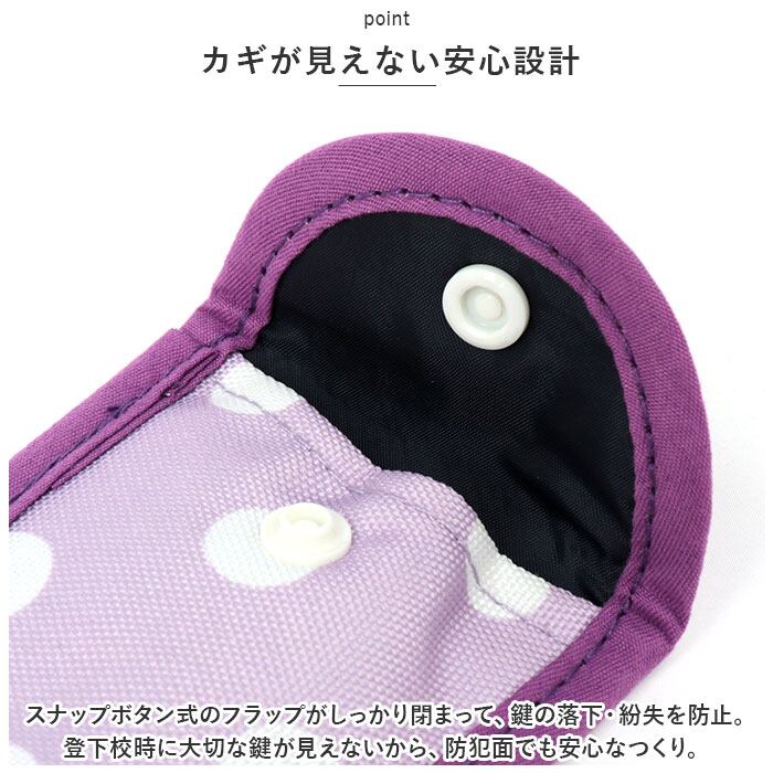 ・スナップボタン式のフラップがしっかり閉まって、鍵の落下・紛失を防止。登下校時に大切な鍵が見えないから、防犯面でも安心なつくり。
