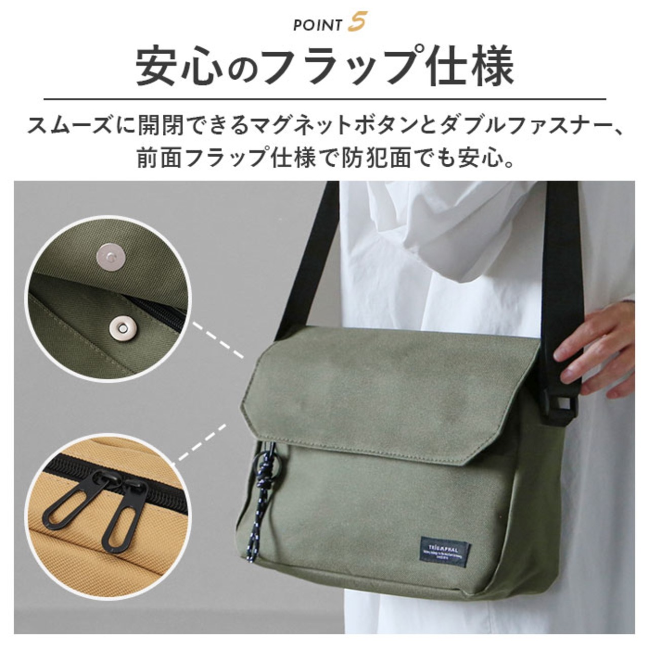 ・マグネット式フラップ&ダブルファスナー。中身がこぼれ落ちずプライバシーも確保。