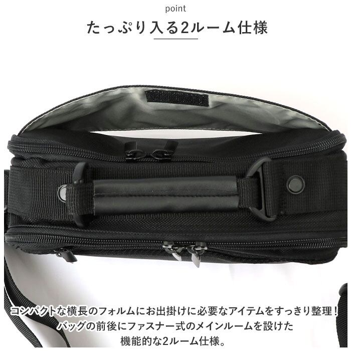 ・コンパクトな横長フォルムにお出掛けに必要なアイテムをすっきり整理!バッグの前後にメインルームを設けた機能的な2ルーム仕様。
