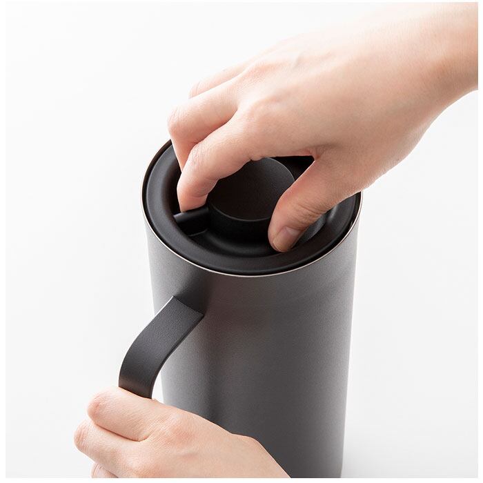 ・ポットに飲み物を注ぎ、中せんを時計回りに閉める。注ぐ時は中せんを反時計回りにまわし、リブを注ぎ口に合わせるだけ。