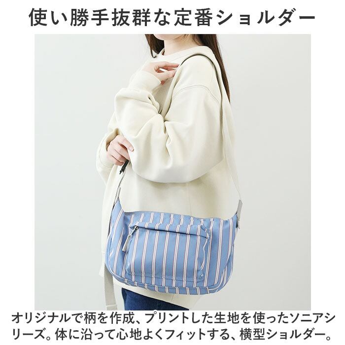 ・オリジナルで柄を作成、プリントした生地を使ったソニアシリーズ。体に沿って心地よくフィットする、横型ショルダー。
