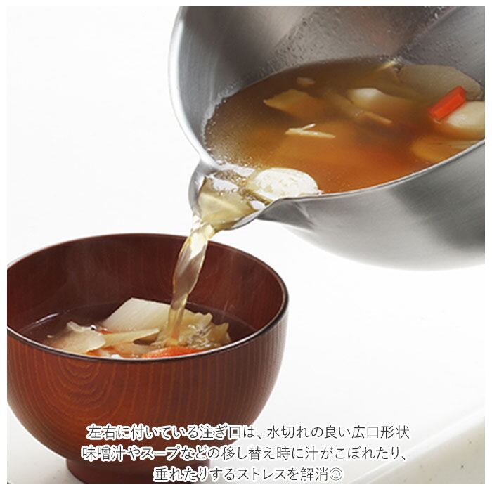 ・左右に付いている注ぎ口は、水切れの良い広口形状。味噌汁やスープなどの移し替え時に汁がこぼれたり、垂れたりするストレスを解消◎