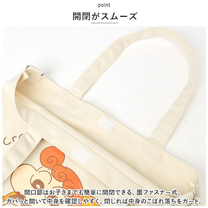 ・開口部はお子さまでも簡単に開閉できる、面ファスナー式。ガバっと開いて中身を確認しやすく、閉じれば中身のこぼれ落ちをガード。