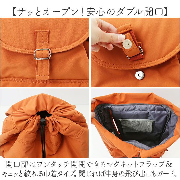 ・開口部はワンタッチ開閉できるマグネットフラップ&キュッと絞れる巾着タイプ。閉じれば中身の飛び出しもガード。