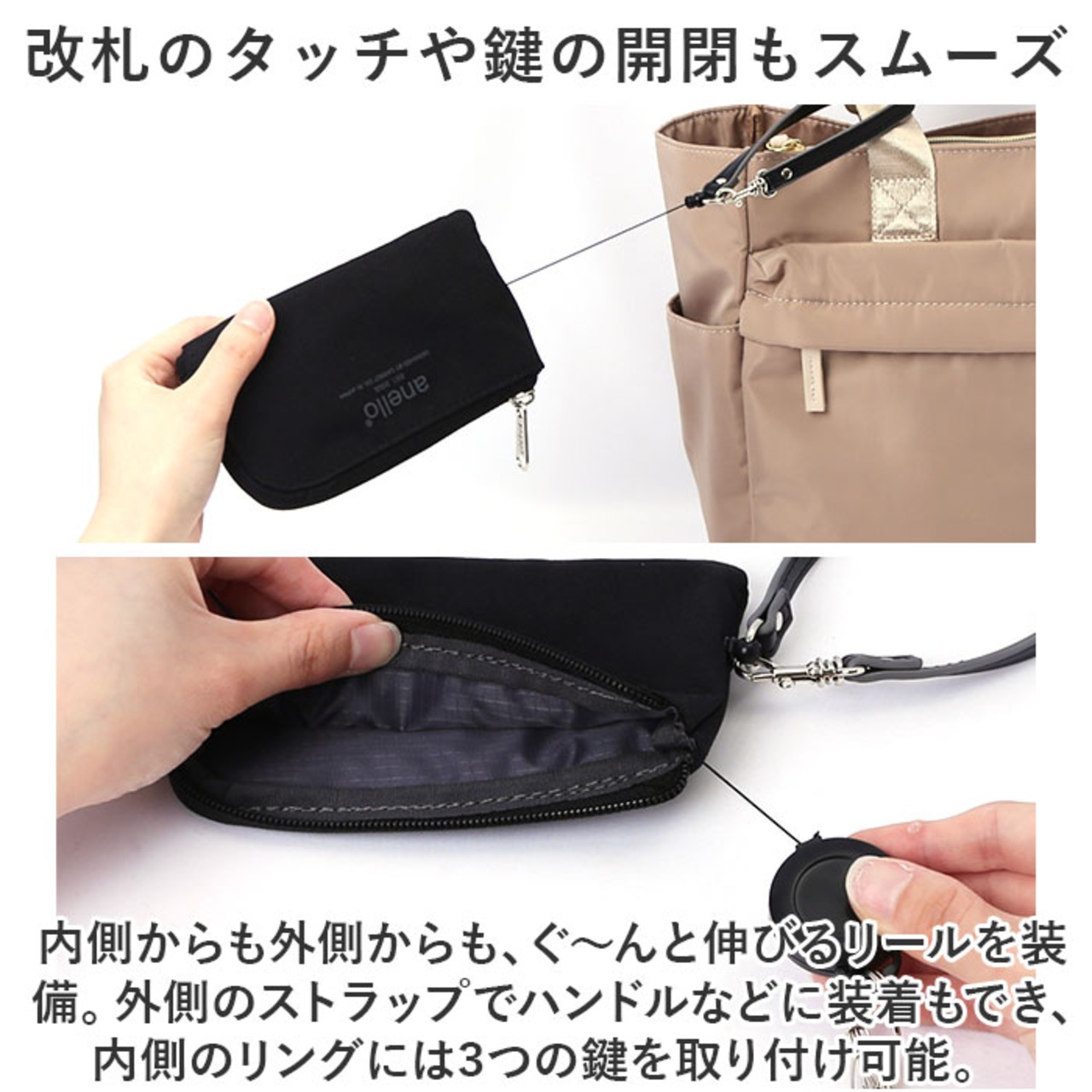 ・内側からも外側からも、ぐ~んと伸びるリールを装備。外側のストラップでハンドルなどに装着もでき、内側のリングには3つの鍵を取り付け可能。