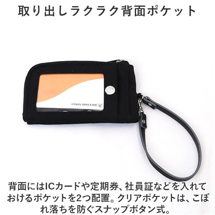 ・背面にはICカードや定期券、社員証などを入れておけるポケットを2つ配置。クリアポケットは、こぼれ落ちを防ぐスナップボタン式。