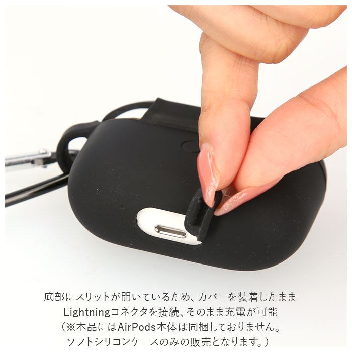 ・底部にスリットが開いているため、カバーを装着したままLightningコネクタを接続、そのまま充電が可能。(※本品にはAirPods本体は同梱しておりません。ソフトシリコンケースのみの販売となります。)