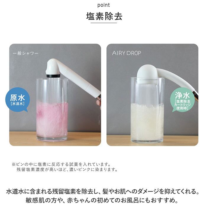 ・水道水に含まれる残留塩素を除去し、髪やお肌へのダメージを抑えてくれる。敏感肌の方や、赤ちゃんの初めてのお風呂にもおすすめ。