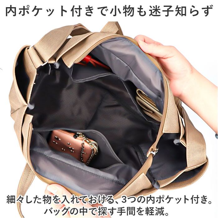 ・細々した物を入れておける、3つの内ポケット付き。バッグの中で探す手間を軽減。