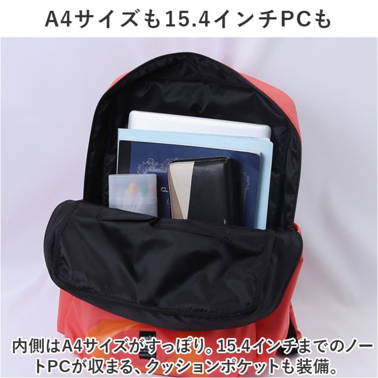 ・内側はA4サイズがすっぽり。15.4インチまでのノートPCが収まる、クッションポケットも装備。