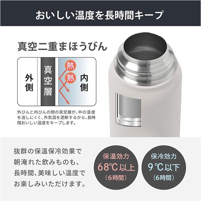 ・本体内側と外側が真空断熱された、ステンレス2重構造タイプ。冷たいものも温かいものも飲み頃温度をキープ!