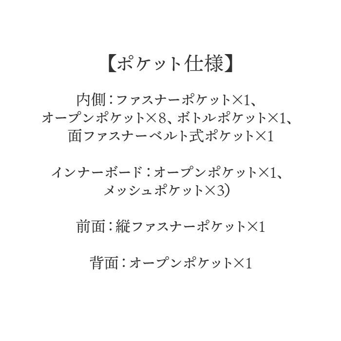 ・内側:ファスナーポケット×1、オープンポケット×8、ボトルポケット×1、面ファスナーベルト式ポケット×1