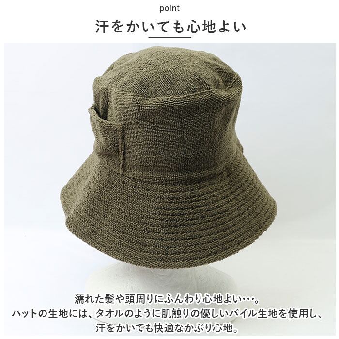 ・濡れた髪や頭周りにふんわり心地よい・・・。ハットの生地には、タオルのように肌触りの優しいパイル生地を使用し、汗をかいても快適なかぶり心地。