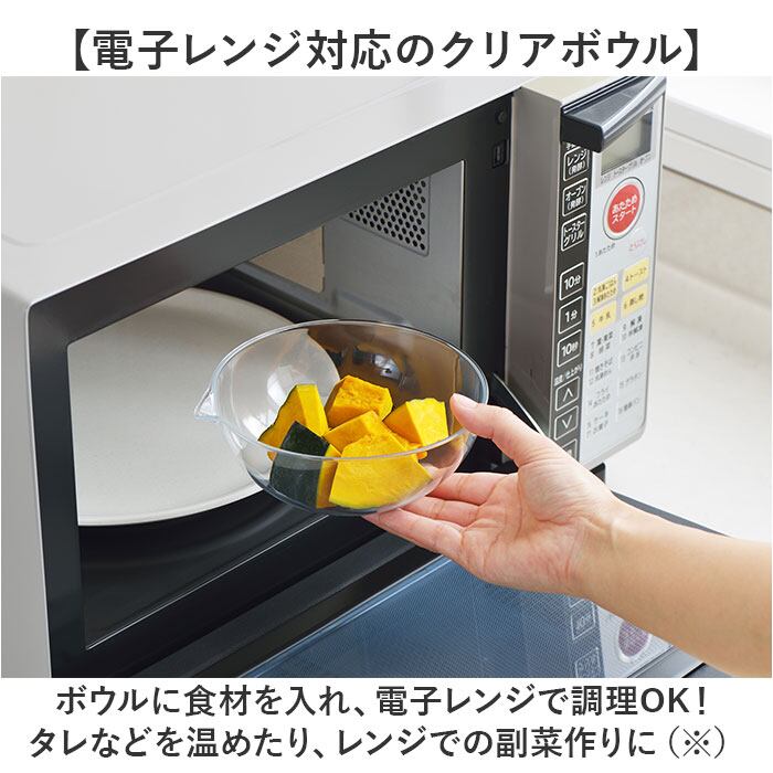 ・ボウルに食材を入れ、電子レンジで調理OK!タレなどを温めたり、レンジでの副菜作りに。