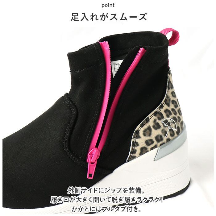 ・外側サイドにジップを装備。履き口が大きく開いて脱ぎ履きラクラク!かかとにはプルタブ付き。