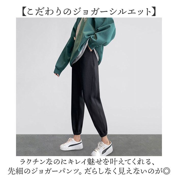 ・ラクチンなのにキレイ魅せを叶えてくれる、先細のジョガーパンツ。だらしなく見えないのが◎