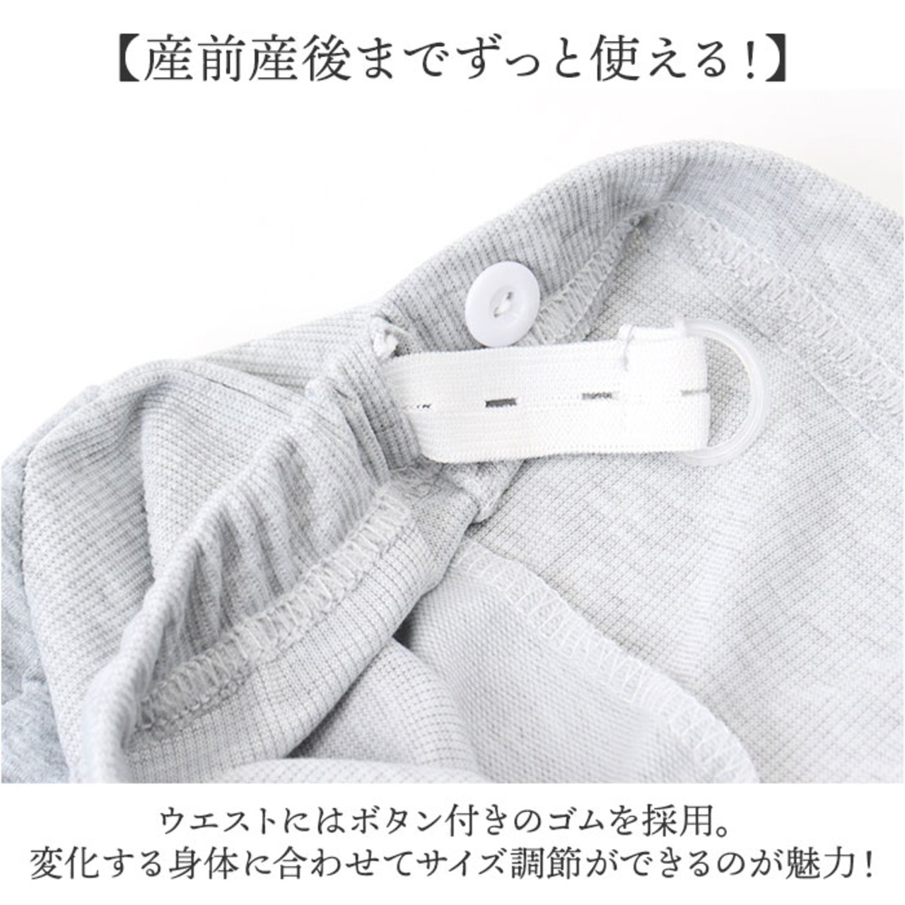 ・ウエストにはボタン付きのゴムを採用。変化する身体に合わせてサイズ調節ができるのが魅力!