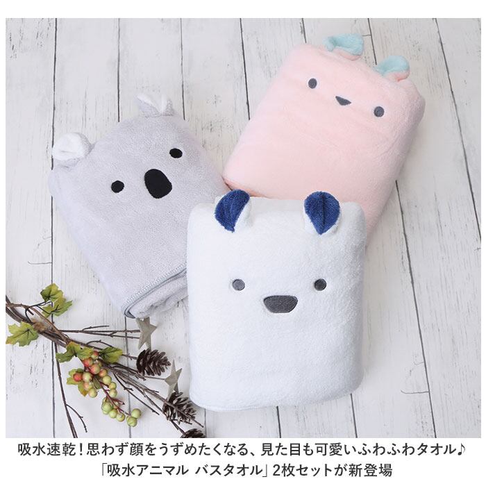 ・吸水速乾!思わず顔をうずめたくなる、見た目も可愛いふわふわタオル♪「吸水アニマル バスタオル」2枚セットが新登場。