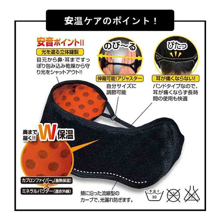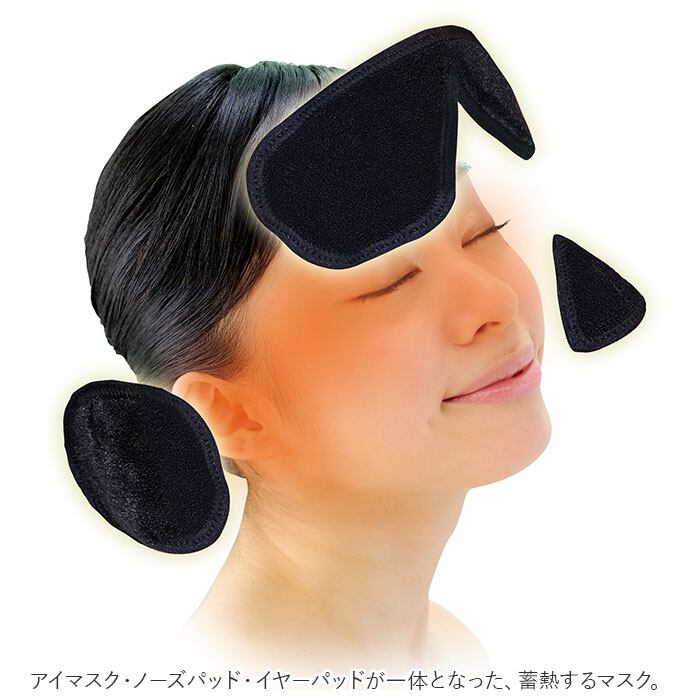 ・アイマスク・ノーズパッド・イヤーパッドが一体となった、蓄熱するマスク。カプロンファイバー(蓄熱保温)とミネラルパウダー(遠赤外線)のW保温!