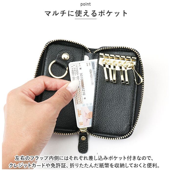・ケース内側に収納した鍵がひと目で分かる、コの字型に大きく開くラウンドファスナーを採用し、鍵や小物の出し入れがスムーズ。