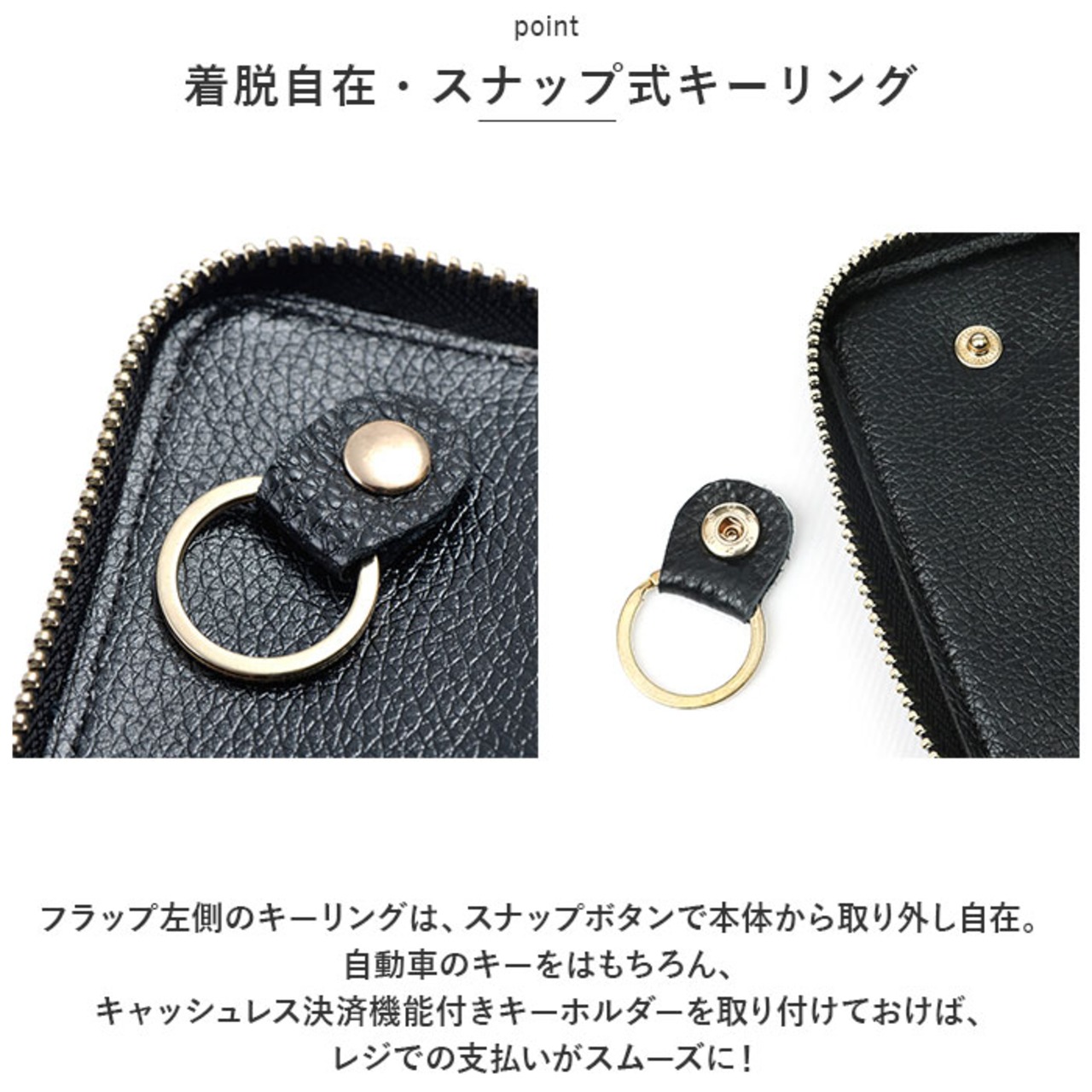 ・フラップ左側のキーリングは、スナップボタンで本体から取り外し自在。自動車のキーをはもちろん、キャッシュレス決済機能付きキーホルダーを取り付けておけば、レジでの支払いがスムーズに!