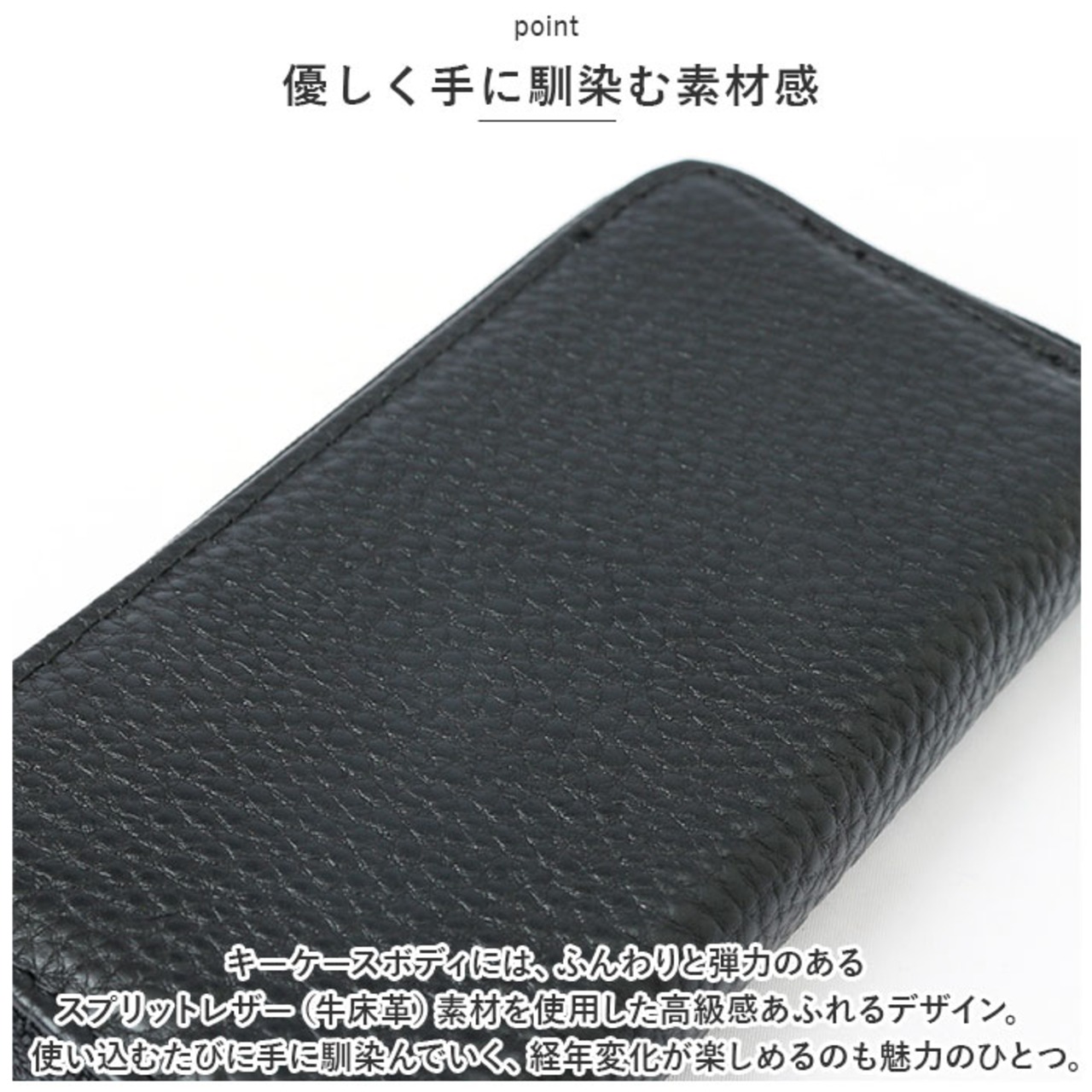 ・キーケースボディには、ふんわりと弾力のあるスプリットレザー(牛床革)素材を使用した高級感あふれるデザイン。使い込むたびに手に馴染んでいく、経年変化が楽しめるのも魅力のひとつ。