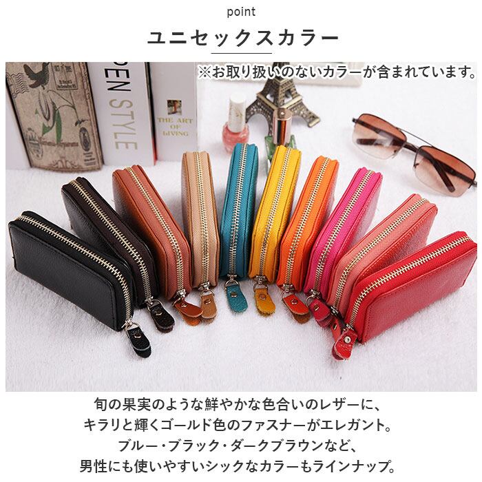 ・旬の果実のような鮮やかな色合いのレザーに、キラリと輝くゴールド色のファスナーがエレガント。ブルー・ブラック・ダークブラウンなど、男性にも使いやすいシックなカラーもラインナップ。