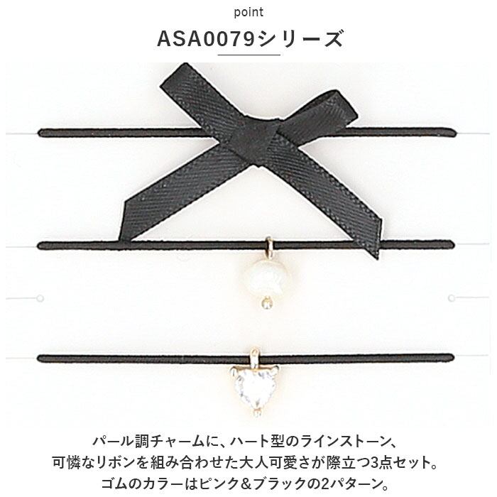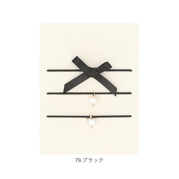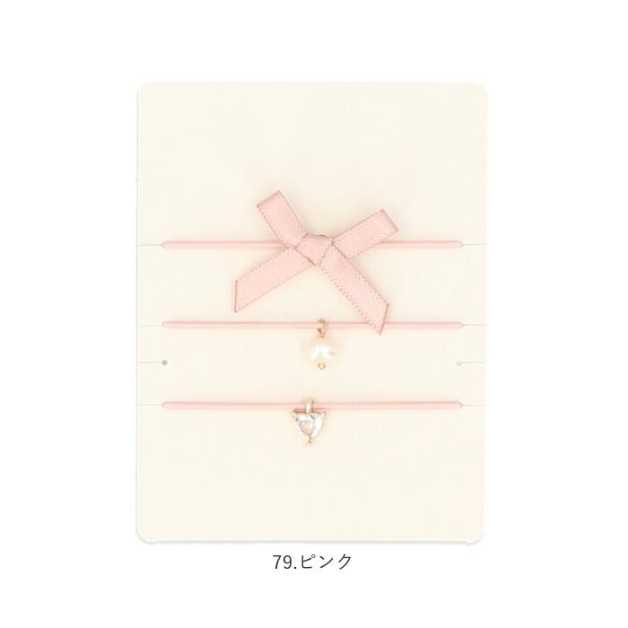 ・パール調チャームに、ハート型のラインストーン、可憐なリボンを組み合わせた大人可愛さが際立つ3点セット。ゴムのカラーはピンク&ブラックの2パターン。