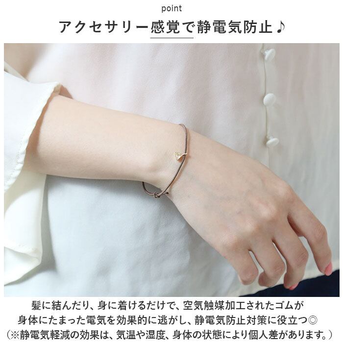 ・髪に結んだり、身に着けるだけで、空気触媒加工されたゴムが身体にたまった電気を効果的に逃がし、静電気防止対策に役立つ◎(※静電気軽減の効果は、気温や湿度、身体の状態により個人差があります。)