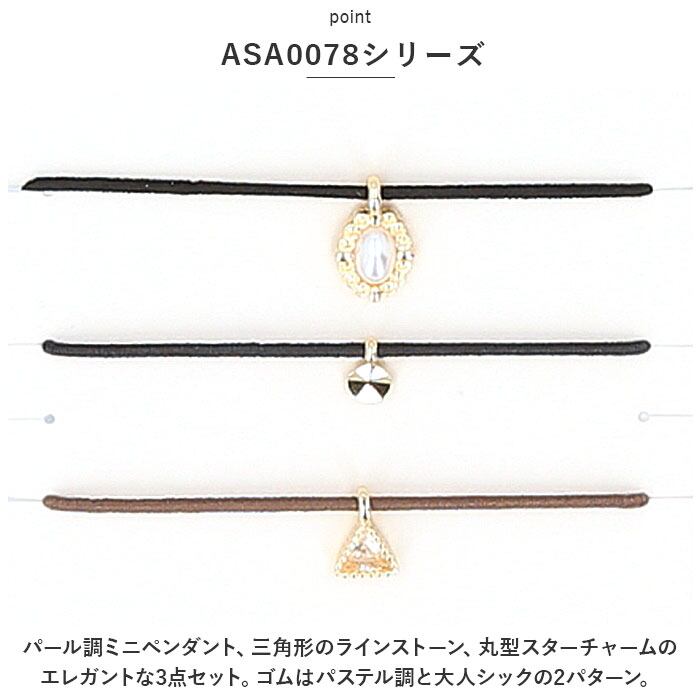 ・パール調ミニペンダント、三角形のラインストーン、丸型スターチャームのエレガントな3点セット。ゴムはパステル調と大人シックの2パターン。