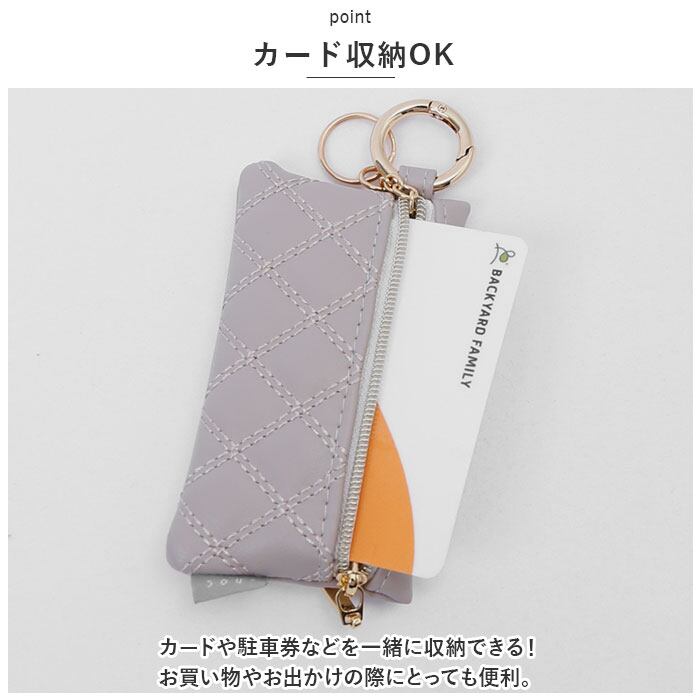 ・キーリングとキーチェーンがついているので、家の鍵や自転車の鍵を収納可能。ポーチ本体を引っかけられる丸カンもついているので持ち歩きしやすい。