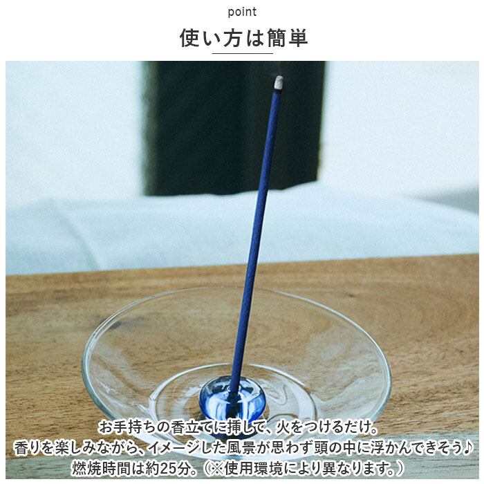 ・お手持ちの香立てに挿して、火をつけるだけ。香りを楽しみながら、イメージした風景が思わず頭の中に浮かんできそう♪燃焼時間は約25分。(※使用環境により異なります。)