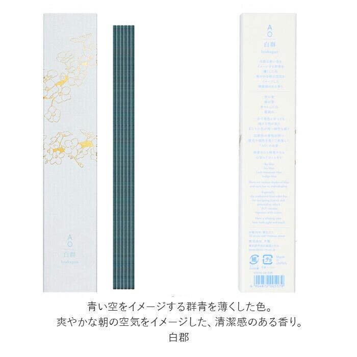 ・白郡…青い空をイメージする群青を薄くした色。爽やかな朝の空気をイメージした、清潔感のある香り。