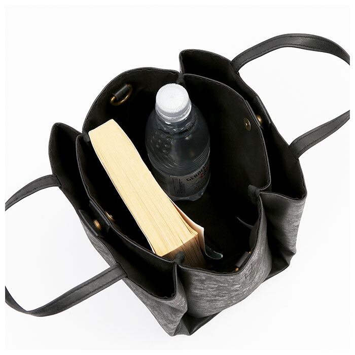 ・収納ルームはしっかりとマチがあり、二つ折り財布やミニポーチ、文庫本などが入るサイズ感。500mlペットボトルは縦向きにすっぽりと収納可能。