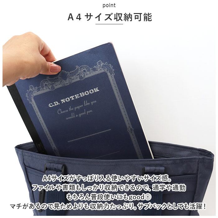 ・A4サイズがすっぽり入る使いやすいサイズ感。ファイルや書類もしっかり収納できるので、通学や通勤もちろん普段使いにもgood◎マチがあるので見ためよりも収納力たっぷり。サブバックとしても活躍!