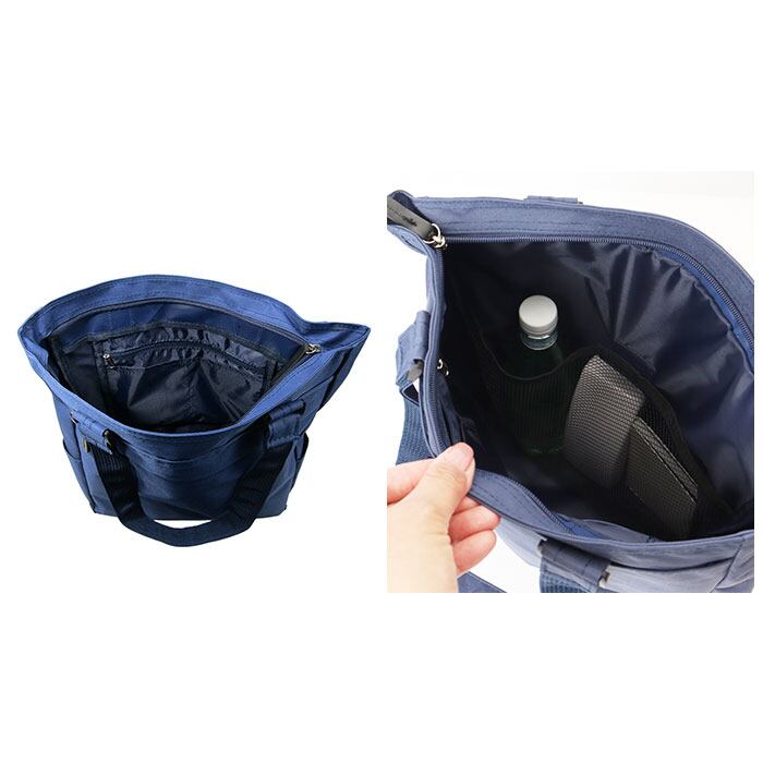 ・スマホやペンなどの小物を分けて収納できる9つのポケットつき。中身が見えるメッシュポケットや、折りたたみ傘を収納できる両サイドのオープンポケットなど、使いやすさにこだわった仕様。