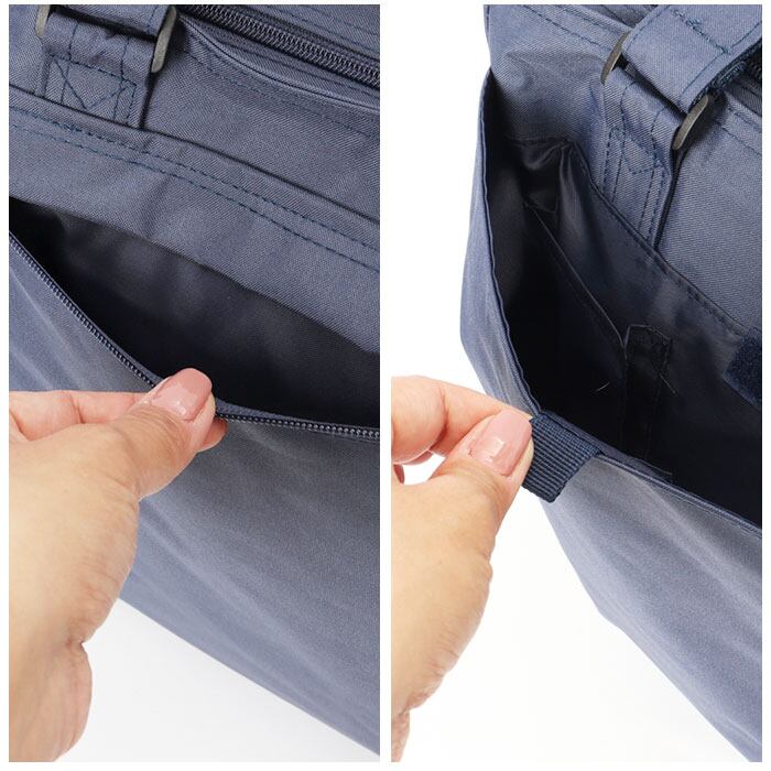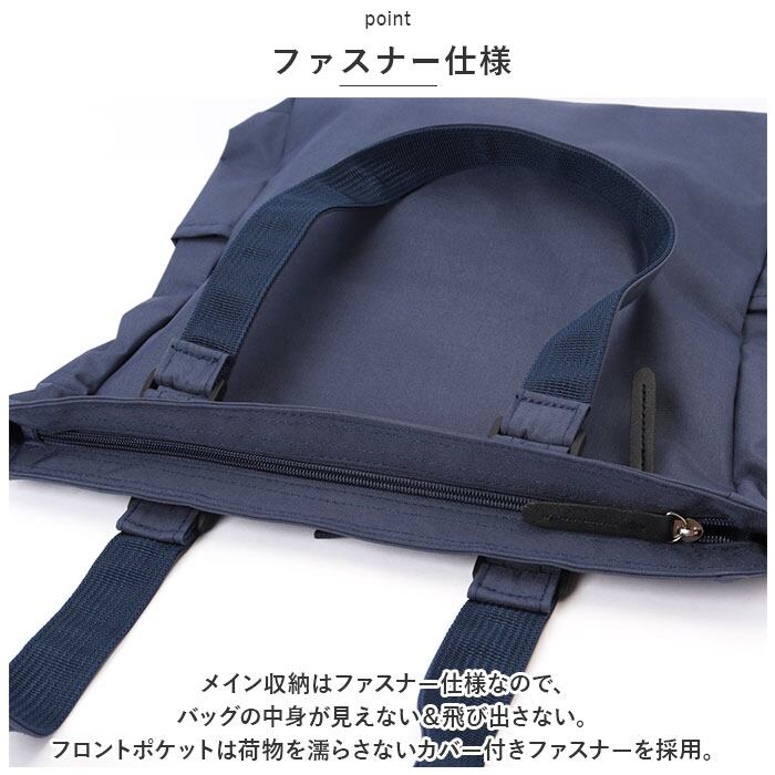 ・メイン収納はファスナー仕様なので、バッグの中身が見えない&飛び出さない。フロントポケットは荷物を濡らさないカバー付きファスナーを採用。