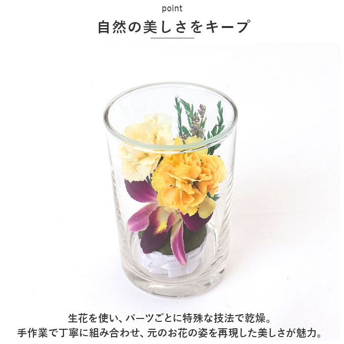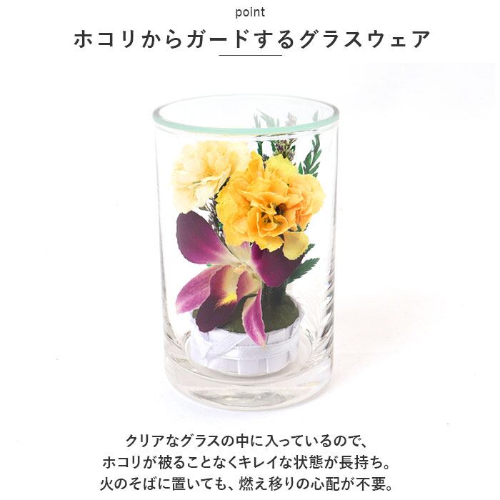 ・透明感のあるグラスがお花をより引き立たせ、故人との思い出に彩りを加えてくれる!自宅用にはもちろん、贈られた方への負担にならないので、高齢のご家族にもおすすめ。