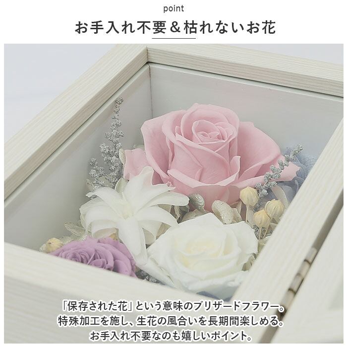 「保存された花」という意味のブリザードフラワー。特殊加工を施し、生花の風合いを長期間楽しめる。お手入れ不要なのも嬉しいポイント。