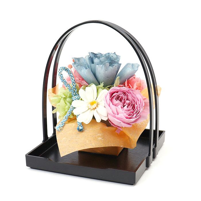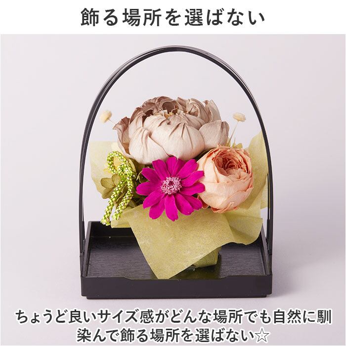 ・グッと引き締まった雰囲気の黒いバスケットを基調にした和風アレンジが目を引く一品。