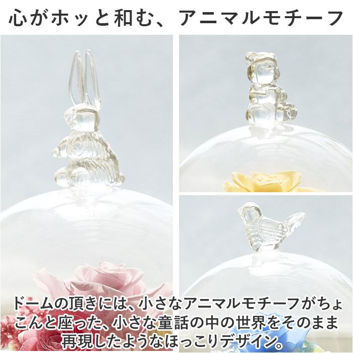 ・クリアドーム部分は台座から取り外し可能。小さなアニマルマスコットやメッセージカードをお花に添えれば、心のこもったフラワーギフトの完成!お世話になった方へのプチギフトや、新築祝い・お引越し祝いにも最適。