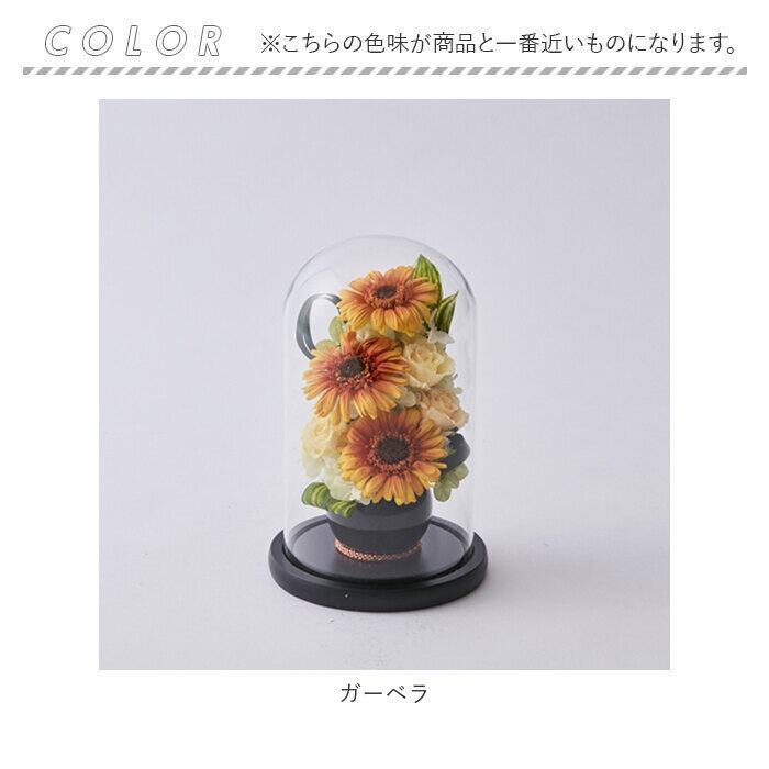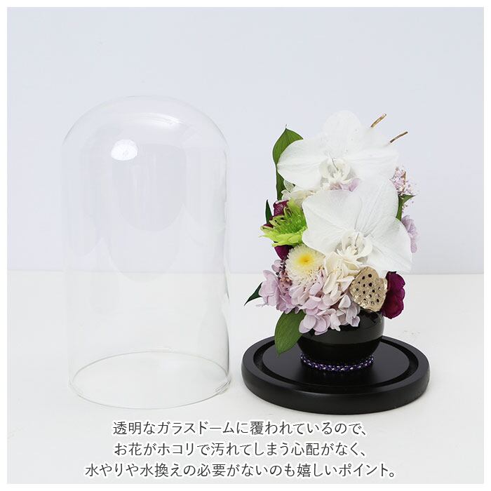 ・透明なガラスドームに覆われているので、お花がホコリで汚れてしまう心配がなく、水やりや水換えの必要がないのも嬉しいポイント。