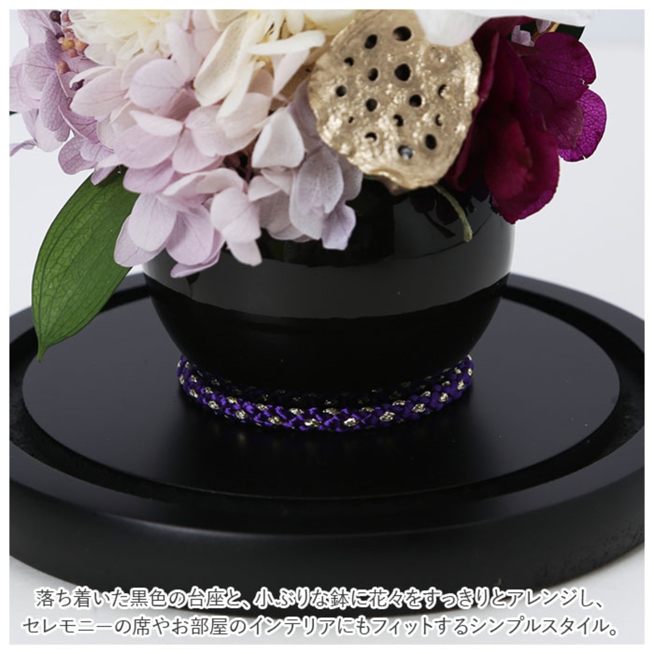 ・落ち着いた黒色の台座と、小ぶりな鉢に花々をすっきりとアレンジし、セレモニーの席やお部屋のインテリアにもフィットするシンプルスタイル。