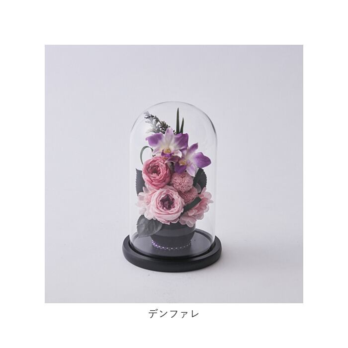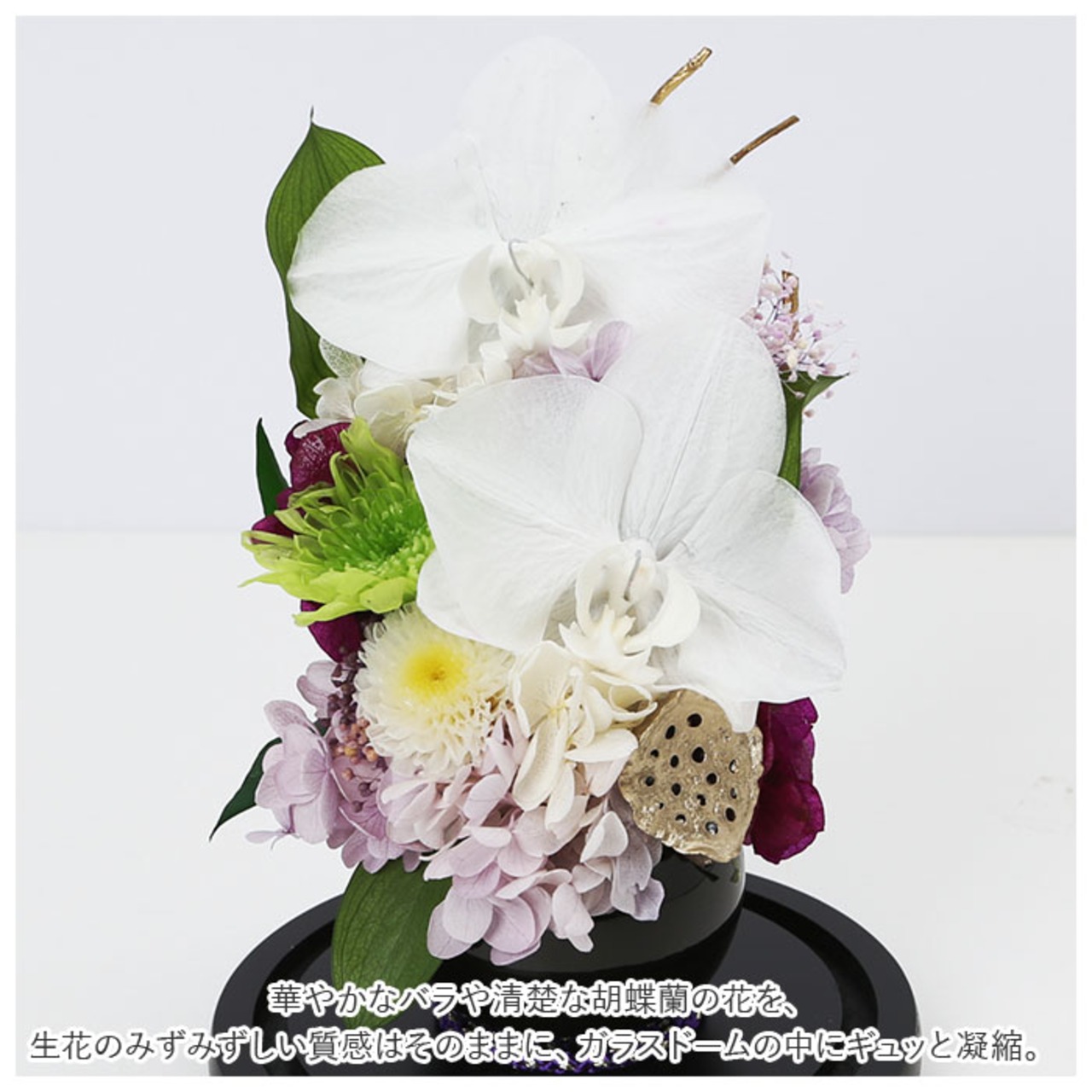 ・華やかなバラや清楚な胡蝶蘭の花を、生花のみずみずしい質感はそのままに、ガラスドームの中にギュッと凝縮。