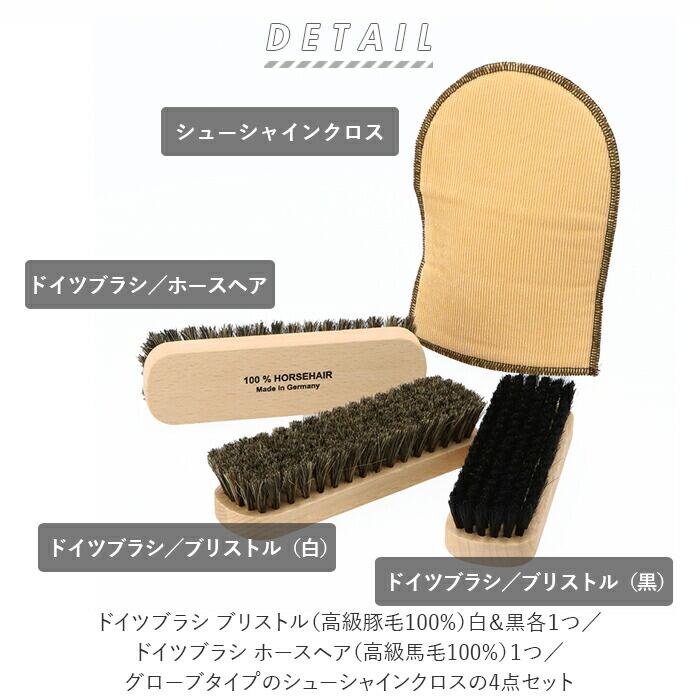 ・ドイツブラシ ブリストル白&黒各1つ、ドイツ ブラシホースヘア1つ、グローブタイプのシューシャインクロスの4点セット!