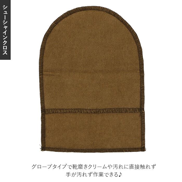 ・シューシャインクロスはクロスの中に手を挿しこんで使用するグローブタイプ!靴磨きクリームや汚れに直接触れずに作業できるので、手が汚れず素早く作業できる。